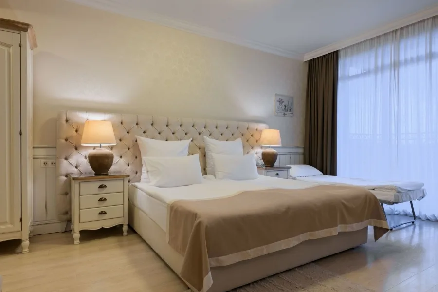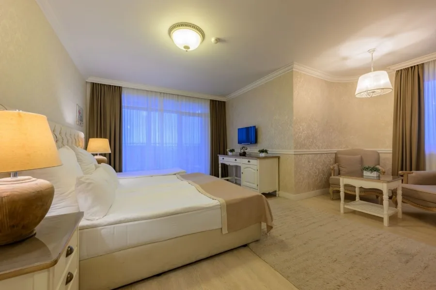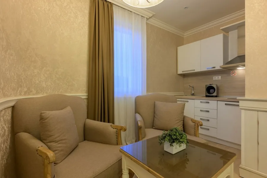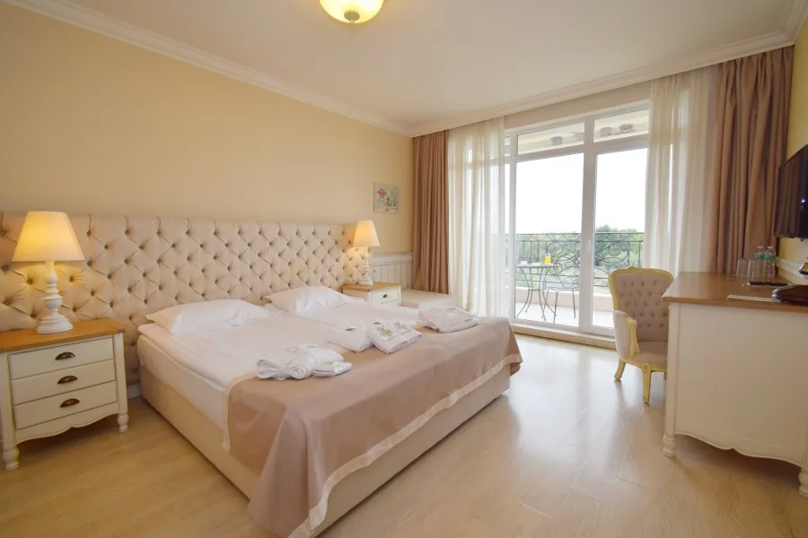 The luxury apartments at TERMA PALACE are 72 square meters in size, with a wonderful view of the sea, stylishly furnished; they have two separate bedrooms with a kitchenette in one of them.