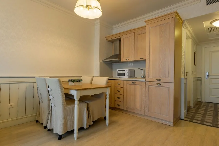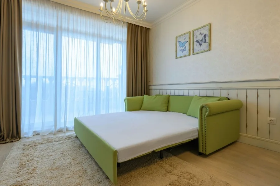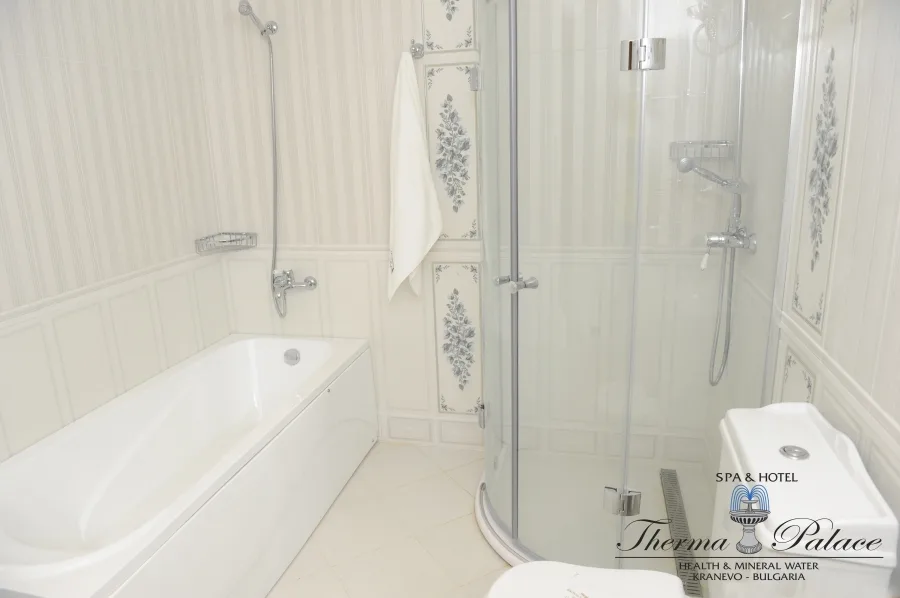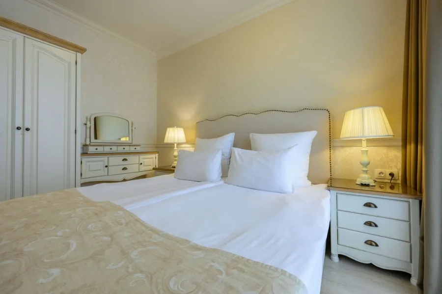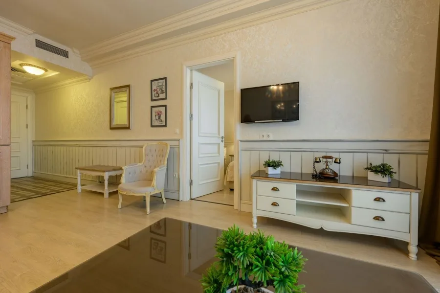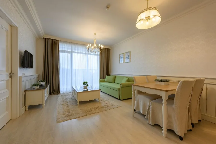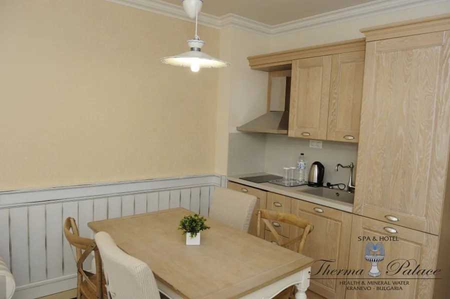 The standard apartments at TERMA PALACE are 47 square meters in size, with a wonderful view of the sea, elegantly furnished and featuring a living room with kitchenette and separate bedroom.