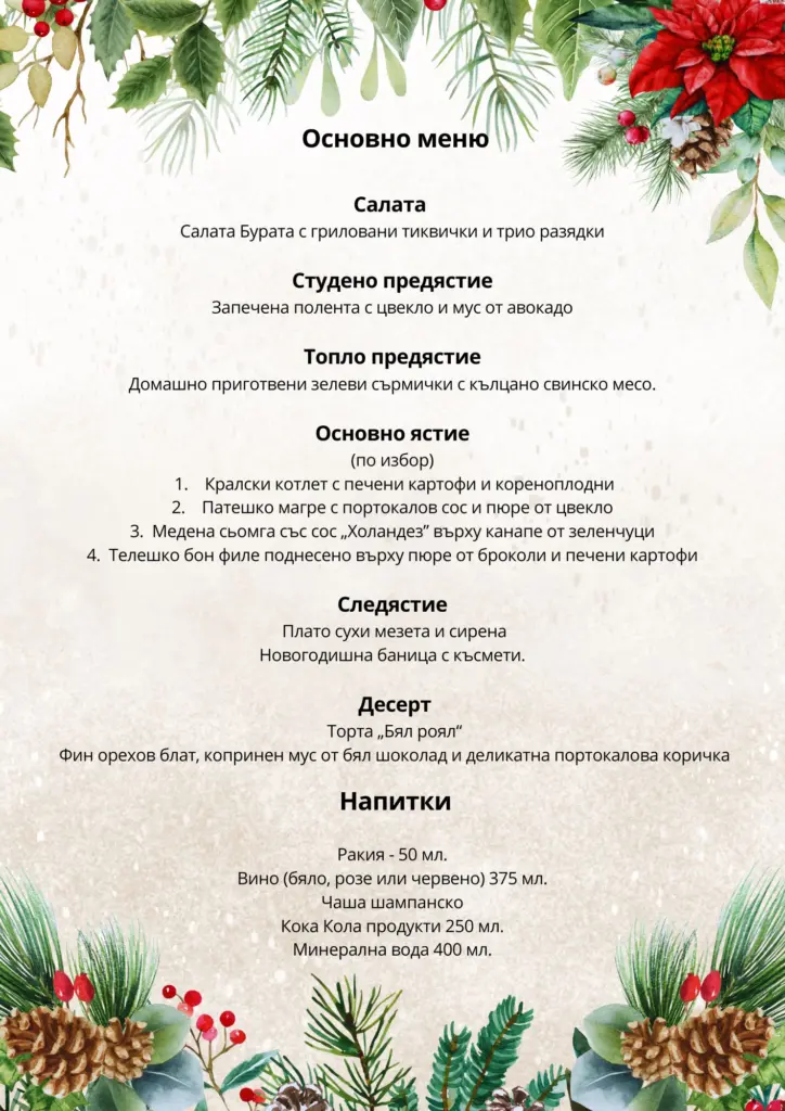 Подготвили сме ви специално музикално-артистично пътешествие с новогодишната програма и изискани кулинарни изненади, които се преплитат в незабравимо преживяване!